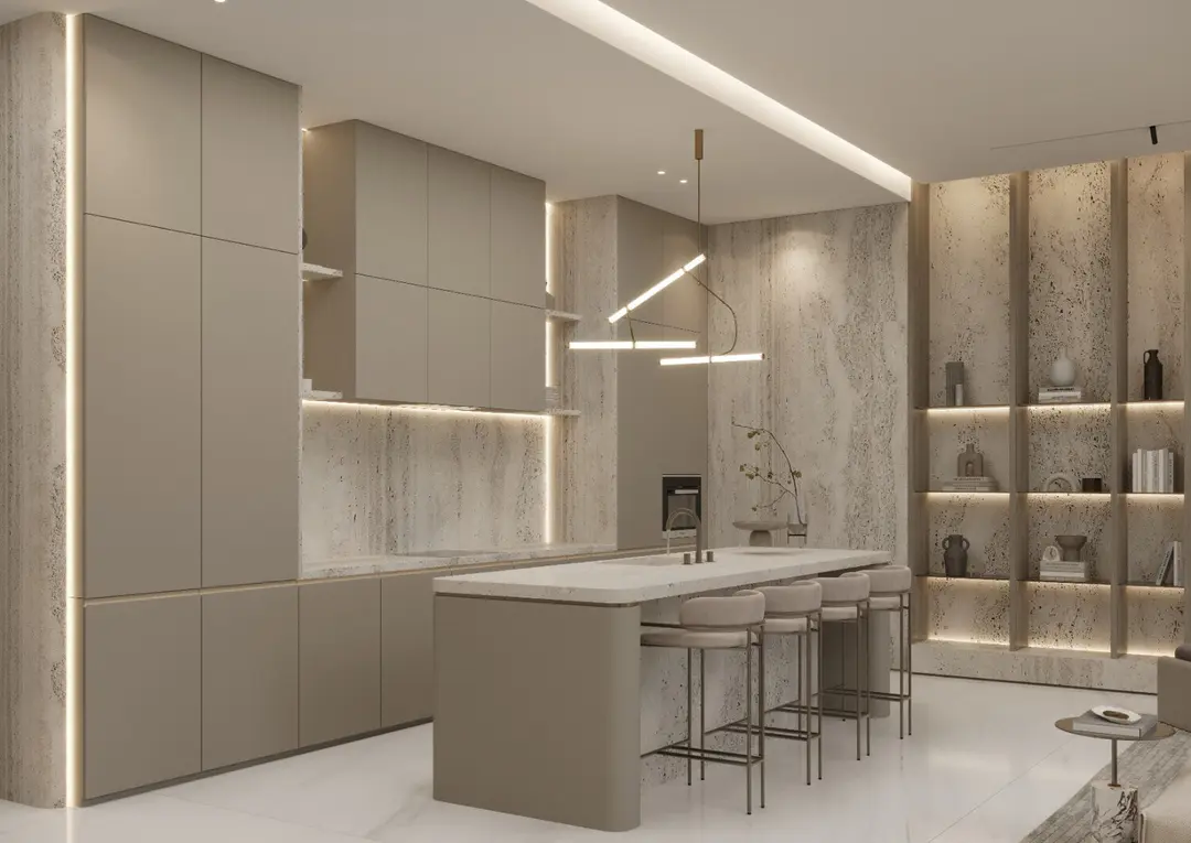 فضاهای داخلی حسی از گرما و انحصار را منتقل میکنند و استفاده از متریالهای پریمیوم و جزئیات سفارشی، تجربه زندگی را ارتقا میدهد.