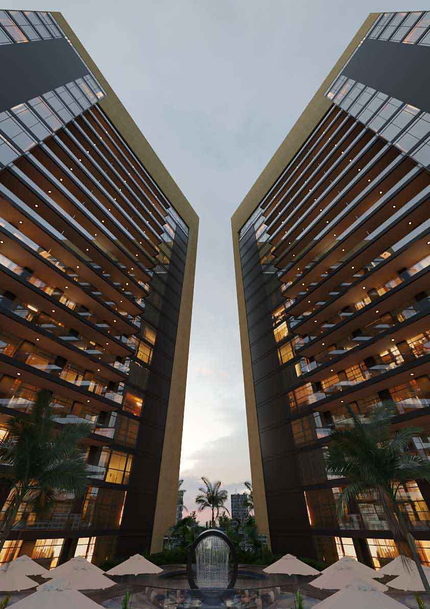• دو برج (Twin Towers) با طراحی ظریف الهام‌گرفته از بالپوش پروانه (Butterfly) و نما با حال و هوای طلایی و استایل لوکس