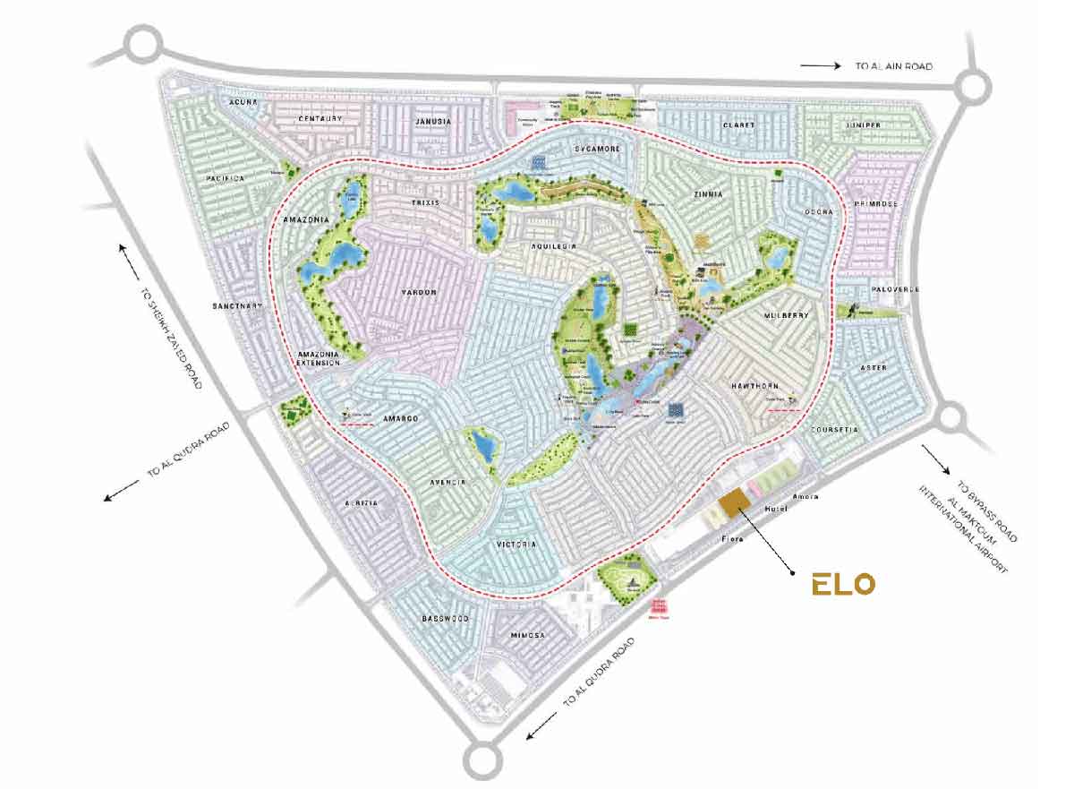 پروژه ELO در منطقه داماک هیلز ۲ واقع شده است که دسترسی آسان به جادههای اصلی مانند جاده جبل علی-لحباب، جاده العین-دبی و جاده امارات را فراهم میکند. فاصلههای تقریبی به برخی از نقاط مهم: