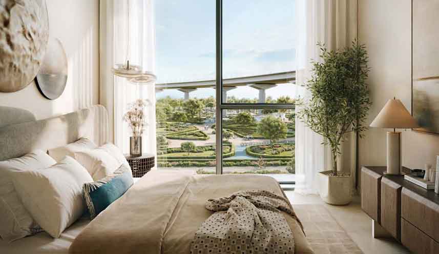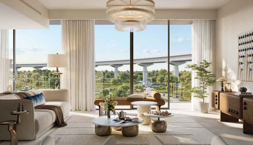 معماری مدرن با نورگیر طبیعی، تراس یا بالکن خصوصی و چشمانداز به آب، فضای سبز و خطوط آسمان دبی
