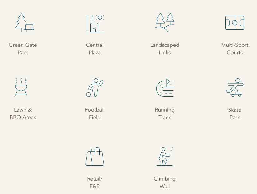 دسترسی پیادهرو به Creek Marina، Green Gate Park و Central Plaza همراه با فضاهای خدماتی مانند رستوران، فروشگاه و کافیشاپ