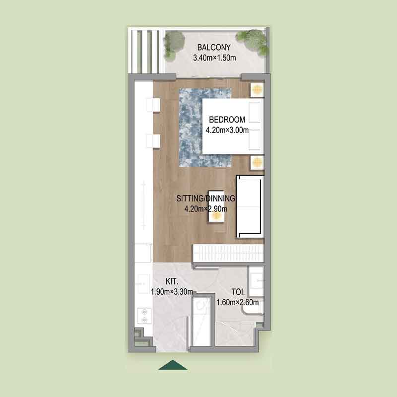 | استودیو | 429 – 484 ft² | 40 – 45 m² | از 625,000 |